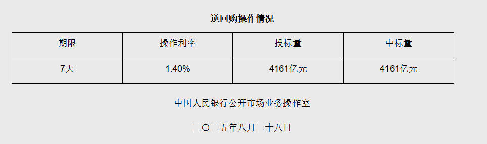 中新网8月28日电 据央行网站消息,2025年8月28日中国人民银行以固定利率、数量招标方式开展了4161亿元逆回购操作。具体情况如下:
