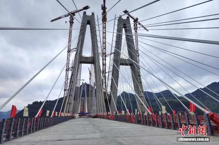 中新网贵阳9月5日电 (记者 瞿宏伦 袁超)5日,贵州乌当(羊昌)至长顺高速公路(以下简称:乌长高速)控制性工程——金旗特大桥实现顺利合龙。大桥在塔梁固结体系的双塔双索面斜拉桥类型中,建设规模与桥梁高度均为世界第一。