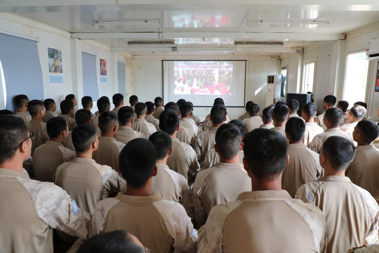维和官兵收听收看纪念中国人民抗日战争暨世界反法西斯战争胜利80周年大会。中国第15批赴南苏丹(瓦乌)维和工兵分队供图
