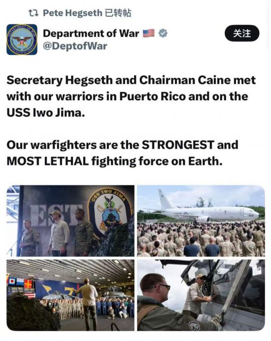 波多黎各总督珍妮弗·冈萨雷斯8日证实,赫格塞思和美军参谋长联席会议主席凯恩当天到访波多黎各,在首府圣胡安以东城市卡罗利纳的国民警卫队基地视察,上军舰做动员。