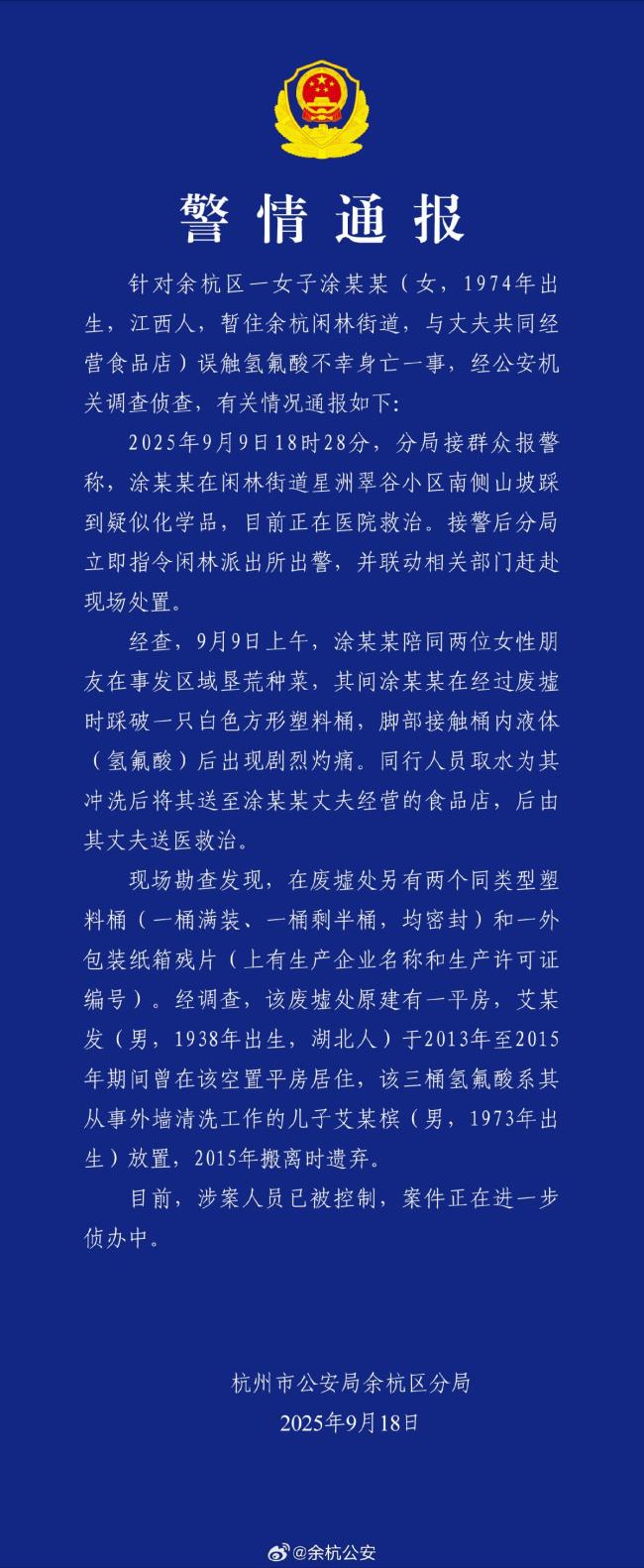 近日,杭州一名52岁女子因误触氢氟酸中毒身亡的事件引发关注。9月18日下午,当地警方通报称,经调查,3桶氢氟酸是从事外墙清洗工作的艾某槟放置的,他在2015年搬离时遗弃了这些危险品。目前,涉案人员已被控制。