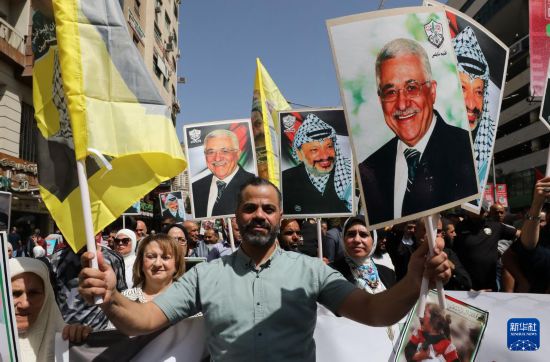 9月23日,在约旦河西岸城市纳布卢斯,民众挥舞巴勒斯坦领导人阿拉法特和阿巴斯画像参加庆祝活动。新华社发(尼达尔·艾仕塔耶摄)