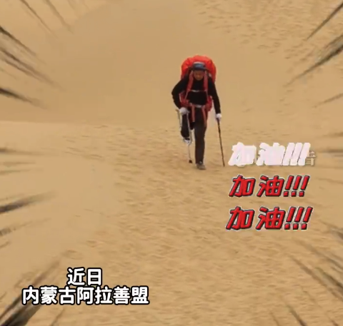 近日,内蒙古阿拉善盟。一位残疾小伙拄拐正在沙漠中前行,身上背着大背包也没有拖累他前行的步伐,每一步都在沙地上留下坚定的印记。拍摄者程先生表示:“觉得这个大哥很棒,特别激励人心,鼓舞着更多的年轻人去户外亲近大自然。”
