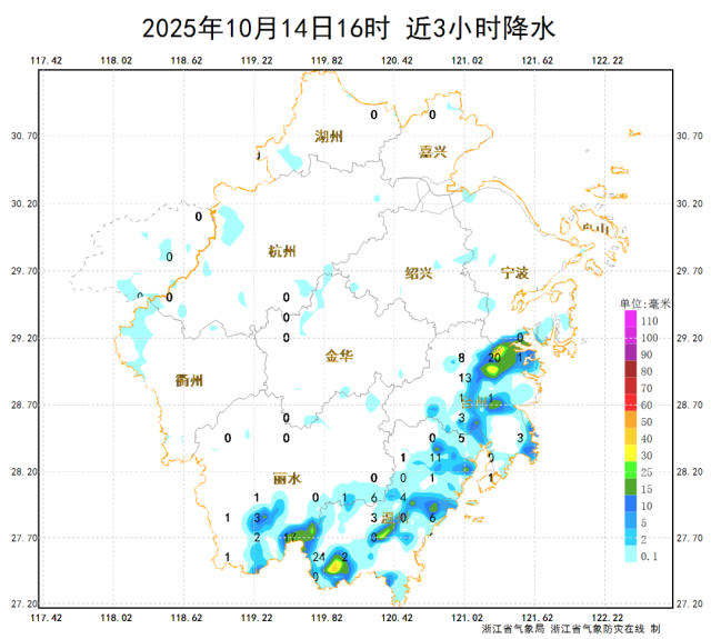14日傍晚到夜里,浙中南和沿海地区阴部分有阵雨或雷雨,局部暴雨到大暴雨,有雷雨地区局地伴有短时暴雨;其他地区阴有时有阵雨。今天,浙北和沿海地区多云到阴有时有阵雨,其他地区多云。午后全省有分散性阵雨或雷雨。明天全省多云到阴,有分散性阵雨或雷雨。早晨最低温度方面,山区17-19℃,沿海地区22-24℃,其他地区20-22℃。白天最高温度方面,浙西北和山区28-30℃,其他地区31-33℃。