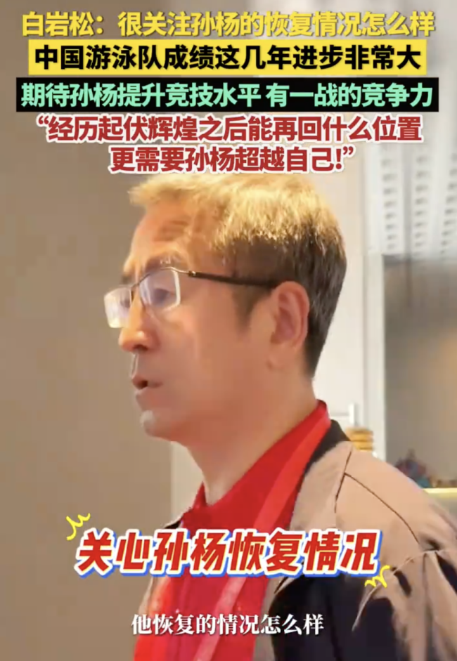 白岩松期待孙杨超越自己。11月12日,广东深圳。中国蓝新闻记者采访白岩松,他表示很关注浙江运动员孙杨。孙杨的恢复情况怎么样,这一切都是以训练为基础。中国游泳队成绩这几年进步非常大,期待孙杨提升竞技水平,能有一战的竞争力!“很期待经历起伏辉煌之后,孙杨能再回什么位置,当然更需要孙杨超越自己!”