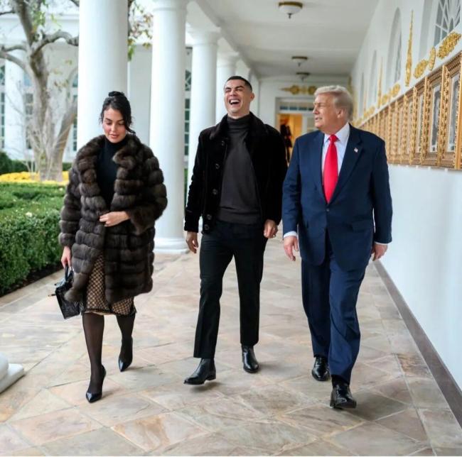 白宫官方在X和Instagram账号上发布了一段特朗普与C罗边走边笑的短视频,配文写道:“两位GOAT(史上最佳)。”C罗也在自己的社交媒体账号上转发了这条视频,并发布了更多照片,回顾这次特别的会面。其中一张照片是C罗与未婚妻乔治娜在椭圆形办公室站在特朗普身后的合影,C罗手中还捧着一把象征性的“白宫钥匙”。