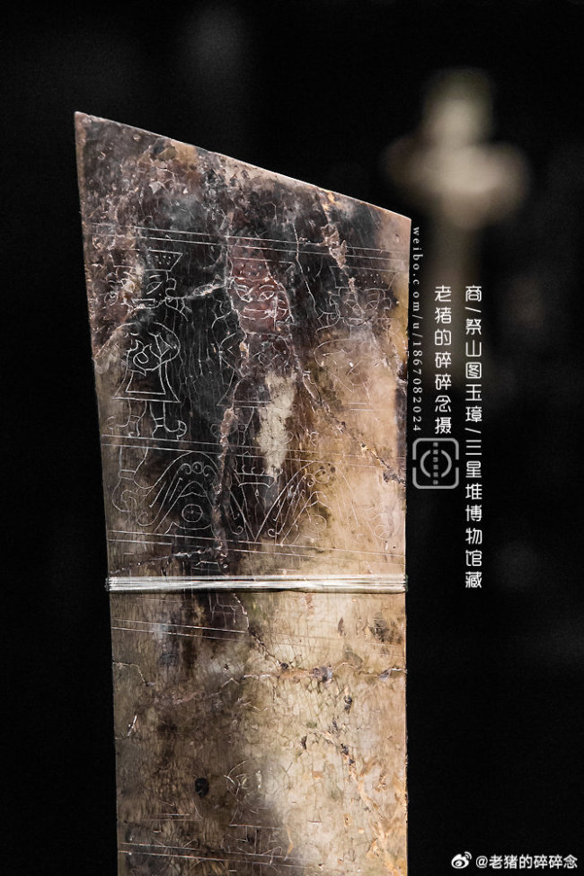 我说当时在三星堆拍摄这件玉璋的时候,上面有明显的拼接修补的痕迹呢,原来是这么回事。这件玉璋之所以珍贵,是因为上面有一幅中国最早的玉器线刻画《祭山图》。这意味着蜀地或为中国绘画的源头。为研究古蜀宗教祭祀礼仪提供了珍贵的资料。图案内容生动刻画了古蜀国原始宗教祭祀场面,反映祭祀神山及神山上神灵,是祭山场面,但又具有图画和纪实的两种原始功能,所以,又可视为罕见的古蜀国巫觋祀山的绘画艺术和图案艺术的有力例证。