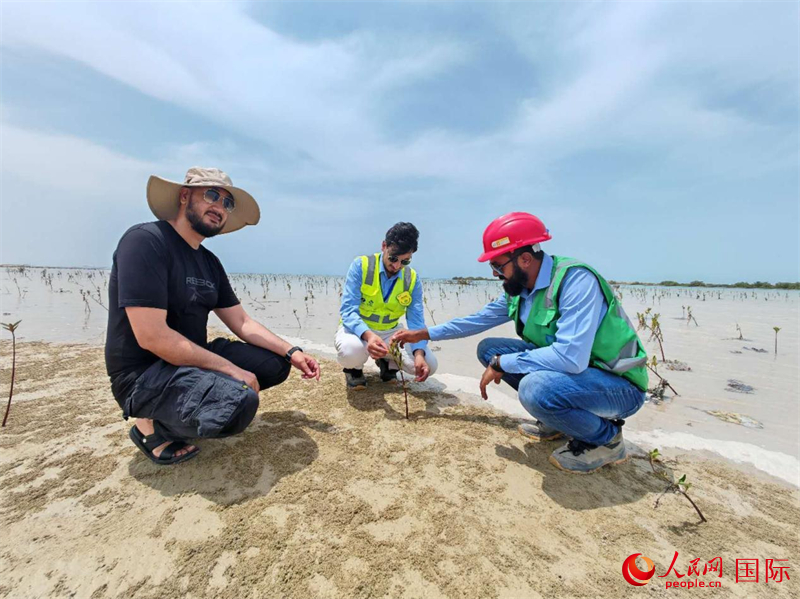 看完珊瑚,哈比卜又带着记者驱车到一片滩涂地。只见一株株红树苗整齐排列,不少地方已经有寄居蟹筑巢其间。红树林修复也是项目重要工作之一。哈比卜说:“红海地区是世界上人类活动最少的地区之一。很高兴能为保护海洋、保护生态作出我们的贡献。”