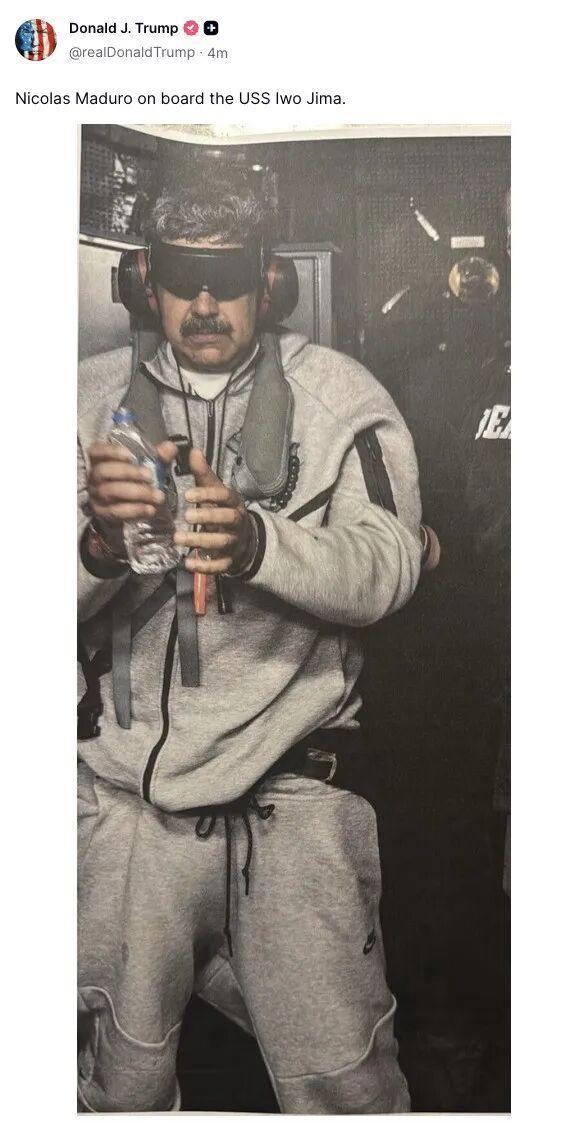 美国总统特朗普在社交媒体上发布了马杜罗在美国军舰上戴手铐、双眼被黑布蒙住的照片。特朗普表示,美军在行动中使用了空中、陆地和海上力量,这是美国军事实力最令人震惊、最有效、最有力的展示之一。特朗普称,委内瑞拉所有军事力量都已丧失战斗力,马杜罗及其妻子都将面临美国司法审判,目前二人在一艘即将前往纽约的船上。特朗普还表示,执法部门在马杜罗夫妇高度戒备时将二人抓捕。