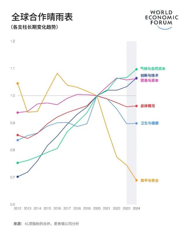 世界经济论坛发布的《2026年全球合作晴雨表》显示,全球贸易与技术合作更倾向于在立场相近的国家间展开,而和平与安全合作则显著下滑。该报告通过41项指标评估了五大支柱:贸易与资本、创新与技术、气候与自然资本、卫生与健康、和平与安全的全球合作状况。