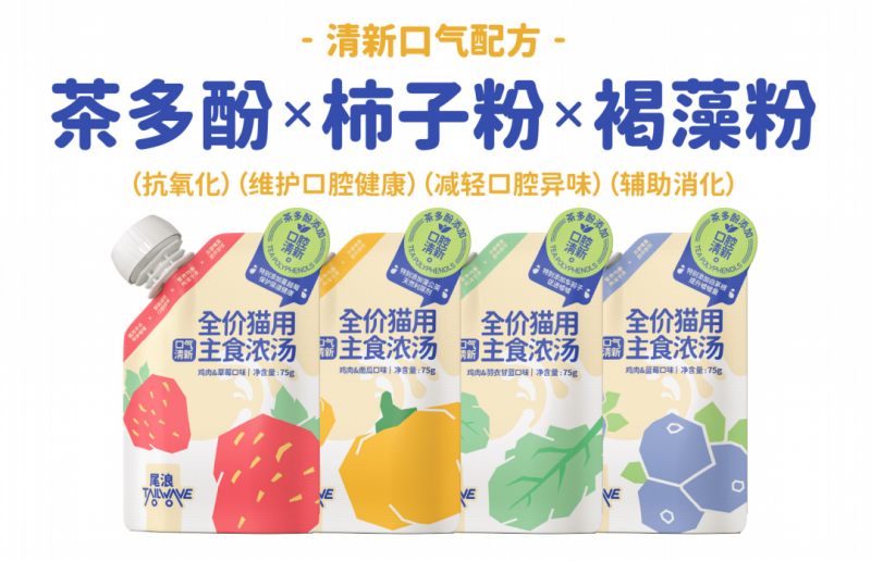 除了特色成分,所有口味的汤包里都包含了尾浪精心搭配的“三重核心成分组”,在日常饮食中默默守护猫咪。