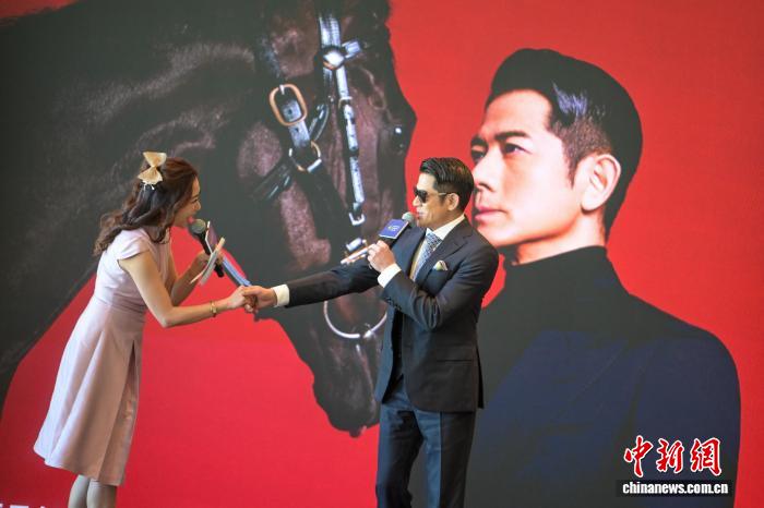 图为香港赛马会行政总裁应家柏(中)、“马年大使”郭富城(右)出席记者会。中新网记者 陈永诺 摄