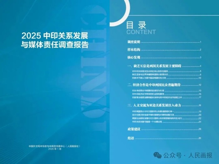 1月16日,《2025中印关系发展与媒体责任调查报告》正式发布。本次民调由中国外文局中东欧与中南亚传播中心(人民画报社)与印度著名智库全球南方地缘经济中心、上海国际问题研究院南亚研究中心联合开展,自2025年10月至12月在中印两国同时进行。