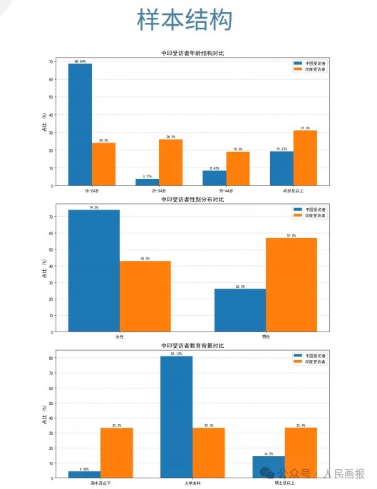 本次调查采用标准化问卷设计,共设置28个核心问题,采用线上线下相结合的方式,收集了来自中国和印度的1854份有效样本,涵盖两国不同性别、学历、职业等方面的受访者。