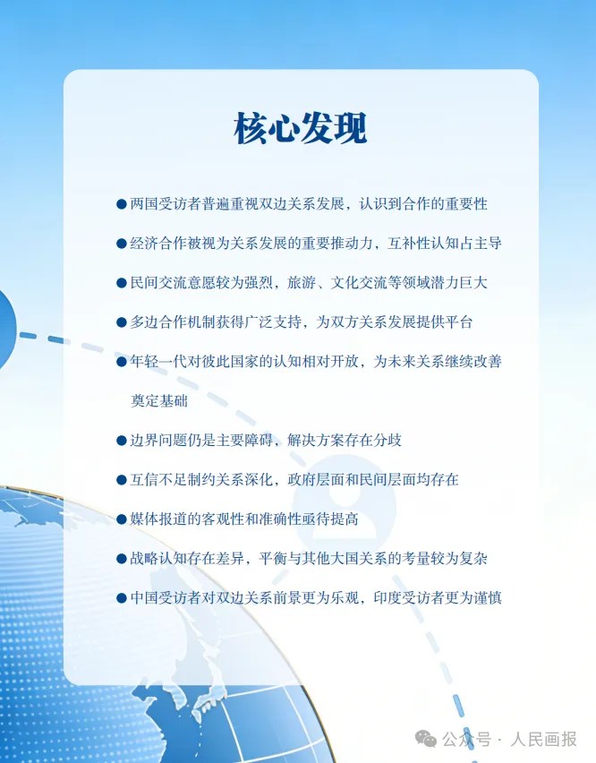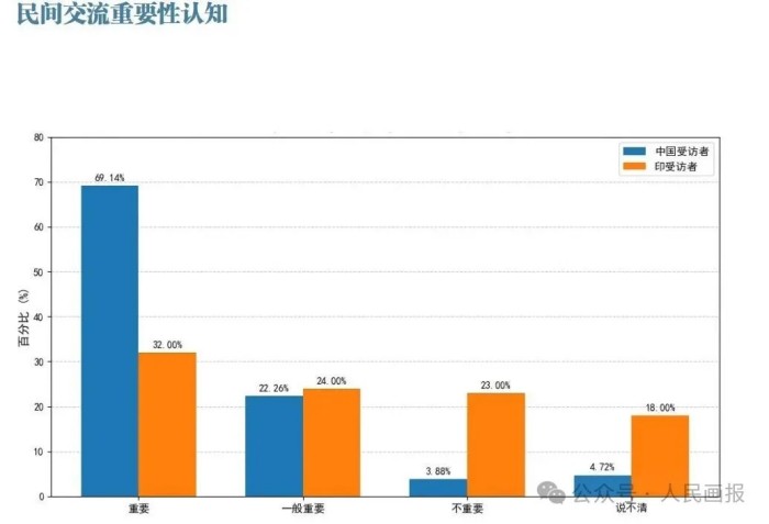 此外,报告指出,中印两国在民间交流重要性认知上高度一致,双方都高度重视民间交流,都认为青年交流最重要,都有强烈的人员往来意愿,都认为签证困难是主要障碍。两国受访者均对中印关系长期向好前景表现出更为明确的预期。