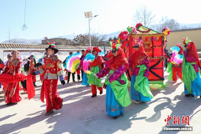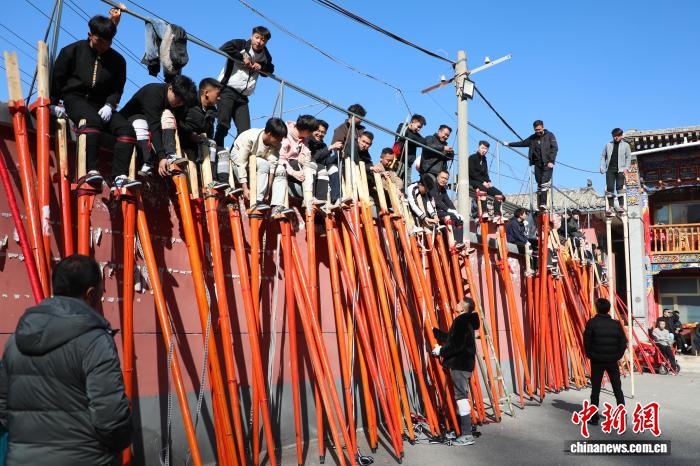 1月22日,青海湟中,民众参与传统社火排练。随着马年春节脚步临近,青海基层组织的文艺表演也进入紧张排练中。中新社记者 马铭言 摄