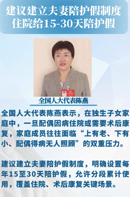 全国人大代表陈燕对记者表示,在现行休假体系中,针对夫妻间的专项陪护制度仍属空白。尤其在独生子女家庭中,一旦配偶因病住院或需要术后康复,家庭成员往往面临“上有老、下有小、配偶得病无人照顾”的双重压力。建议建立夫妻陪护假制度,明确设置每年15至30天陪护假,允许分段累计使用,覆盖住院、术后康复关键场景。