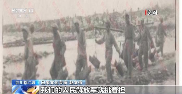巴蜀文化专家 赵文侨:这张图反映的就是在1949年12月的时候,中国人民解放军就进驻到了都江堰。照片里我们的人民解放军挑着担,亲自下场进行了对河道的疏浚的工作。