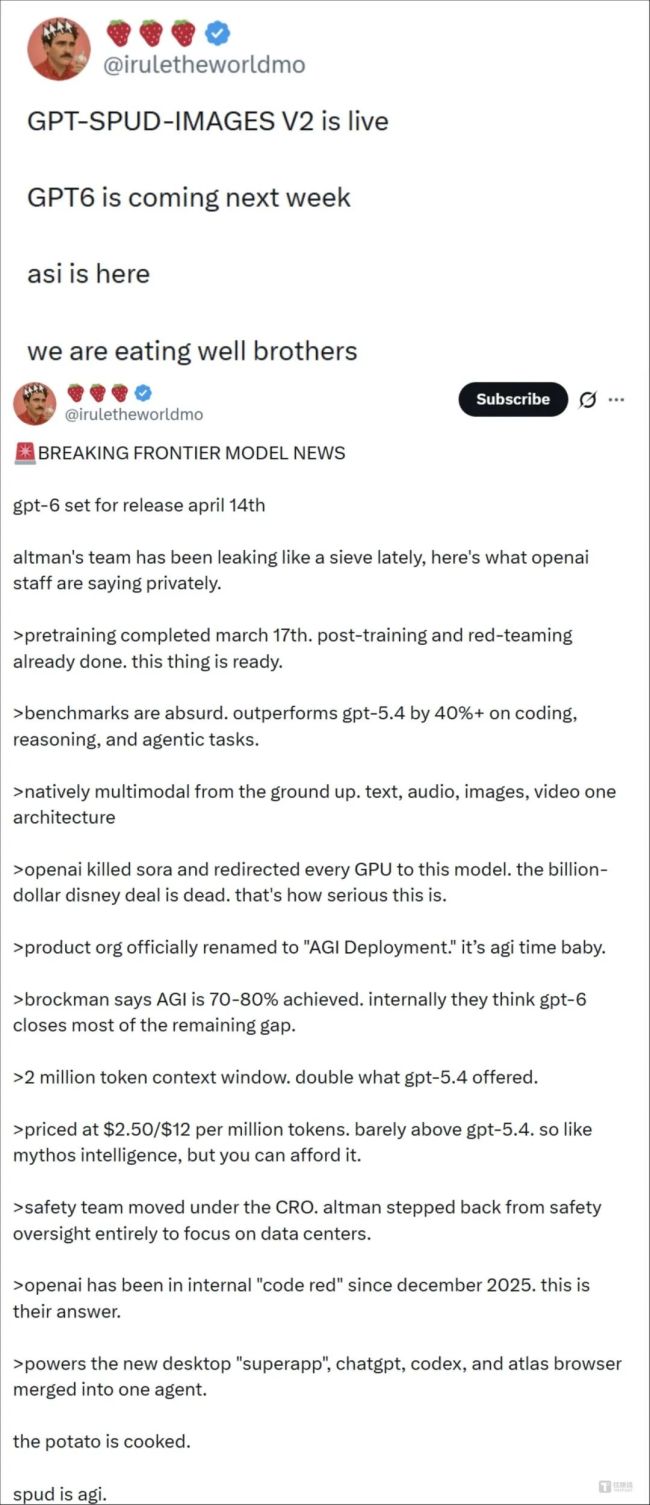 2026年4月初,X平台科技博主@iruletheworldmo率先爆料:OpenAI内部代号"Spud"(土豆)的下一代模型GPT-6,已完成预训练,预计将于4月14日发布。