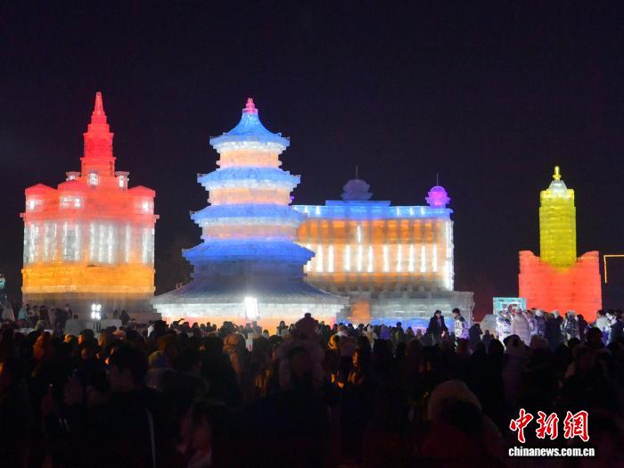 2025年12月19日晚,长春冰雪新天地开门迎客,整个园区仿佛一座如梦如幻的冰雪王国,引来大量游客。张瑶 摄