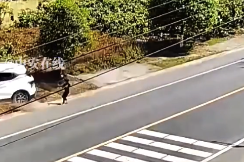 4月4日,贵州。一名女童独自奔跑着过马路,白车车速过快急刹与孩子擦身而过,直接撞进树丛里。女孩家属:“希望大家都看护好孩子。”