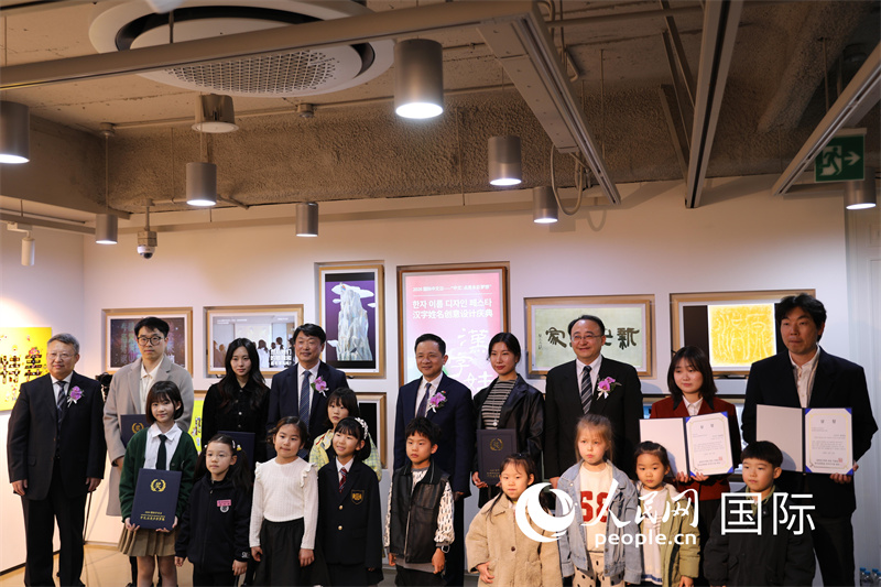 出席活动的嘉宾与“汉字姓名创意设计”获奖者合影。人民网记者 莽九晨摄
