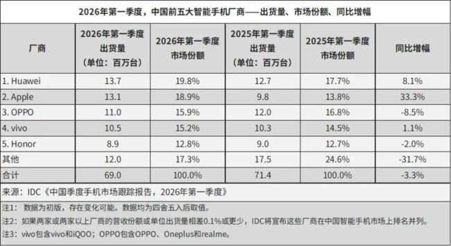 中国市场亦是如此,仍处于负增长的通道中。IDC数据显示,2026年第一季度,中国智能手机市场出货量约为6,901万台,同比下降3.3%。而在报告中,IDC也给出了一个更为扎心的结论:“总体来看,尽管2026年开年中国智能手机市场出现小幅回落,但预计将成为全年表现最佳季度。”