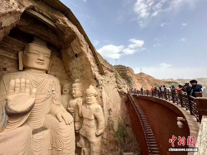 4月22日,甘肃武威,台湾旅行商参观“中国石窟鼻祖”天梯山石窟,感受精湛的古代雕刻与绘画艺术。4月22日至28日,随着丝路游升温,台湾旅行商一行走进甘肃考察踩线,深入感悟丝路魅力,寻觅丝路文旅交流新机遇。图为台湾旅行商在天梯山石窟创意留影。闫姣 摄