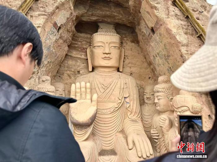 4月22日,甘肃武威,台湾旅行商参观“中国石窟鼻祖”天梯山石窟,感受精湛的古代雕刻与绘画艺术。4月22日至28日,随着丝路游升温,台湾旅行商一行走进甘肃考察踩线,深入感悟丝路魅力,寻觅丝路文旅交流新机遇。图为台湾旅行商参观大佛雕塑。闫姣 摄