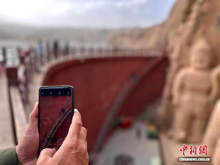 4月22日,甘肃武威,台湾旅行商参观“中国石窟鼻祖”天梯山石窟,感受精湛的古代雕刻与绘画艺术。4月22日至28日,随着丝路游升温,台湾旅行商一行走进甘肃考察踩线,深入感悟丝路魅力,寻觅丝路文旅交流新机遇。图为台湾旅行商走访拍摄大佛雕塑。闫姣 摄