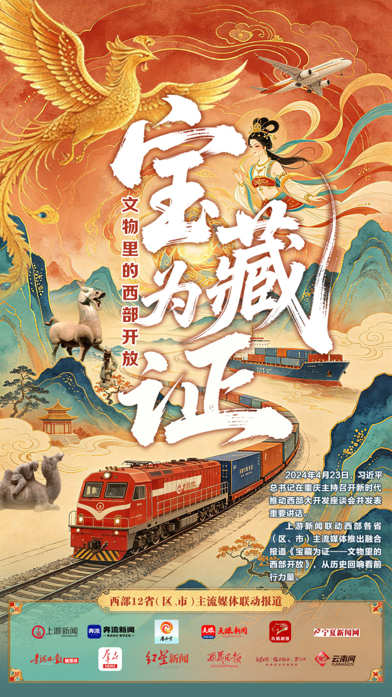 今天,上游新闻联动奔流新闻、广西云—广西日报、贵州日报天眼新闻、奔腾融媒、宁夏新闻网、青海日报、群众新闻、红星新闻、西藏日报、新疆日报、云南网,西部十二省(区、市)主流媒体推出融合报道《宝藏为证——文物里的西部开放》,以“古道驼铃·钢铁长龙”“国货出海·商路鎏金”“织梦苍穹·凤舞九天”三个篇章,记录从漫漫古道到中欧班列,从海上丝路到西部陆海新通道,从织梦苍穹到空中走廊的变化。