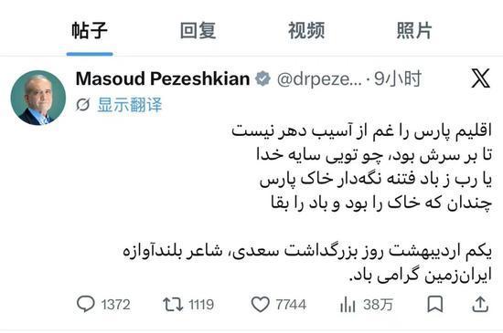 波斯大地不因世间的苦难而悲伤,只要有神荫如你般笼罩其上。哦,主啊,请从风暴中守护这片土地——只要土地长存,风暴亦将永恒。这是古波斯诗人萨迪的诗句,在美伊停火协议即将结束前,伊朗总统佩泽希齐扬在社交平台上引用了这首诗。