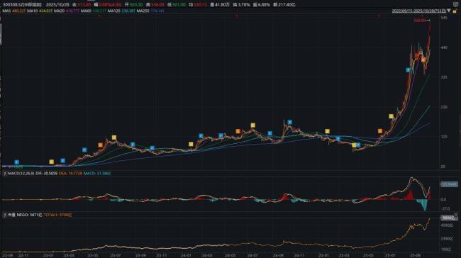 中际旭创的万亿市值是技术沉淀与行业红利共振的结果。2023年2月,公司股价仅21.23元,市值不足200亿元;2024年9月,股价涨至184.9元,市值破千亿;2025年3月开启第二轮上涨,一年涨幅超1200%。