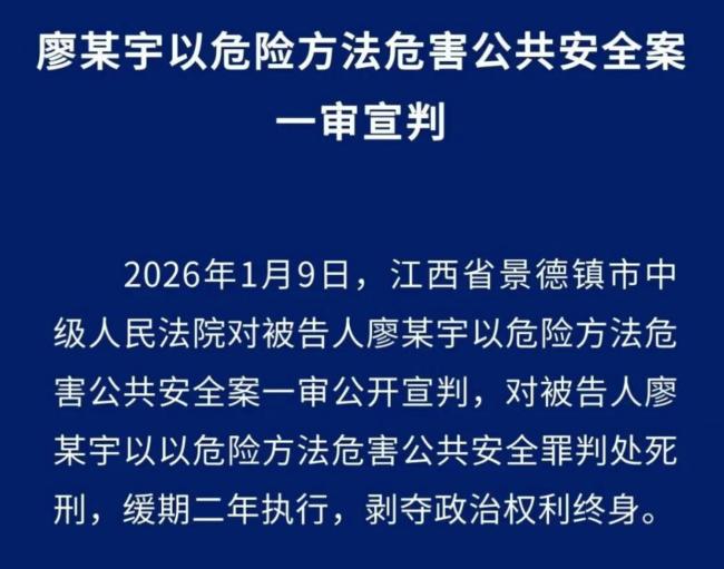1月9日,景德镇一家三口被撞身亡案一审宣判。景德镇中院判决廖某宇以危险方法危害公共安全罪,判处死刑,缓期二年执行,剥夺政治权利终身