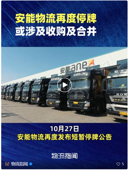 10月27日上午,安能物流再度发布短暂停牌公告。