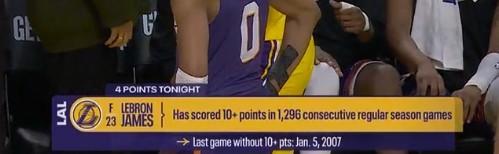 詹姆斯延续得分上双纪录 艰难维持纪录