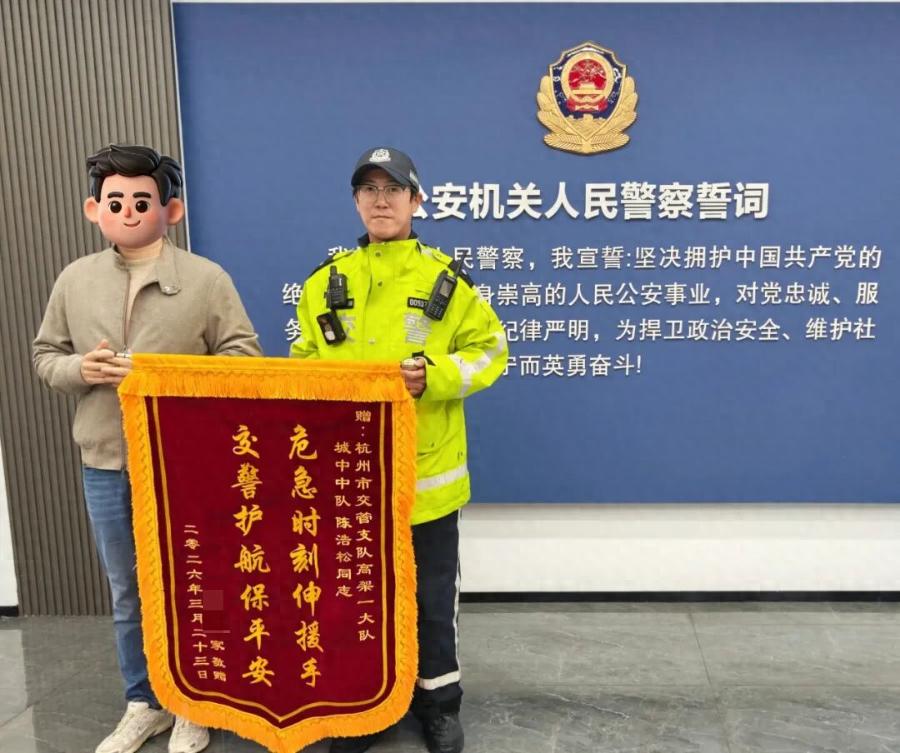 3月24日下午黄先生一家走进杭州公安交管高架一大队城中中队向铁骑队队员陈浩松送上一面锦旗危难时刻伸援手交警护航保平安3月16日8时48分早高峰虽已接近尾声钱塘快速路天目山路隧道内车流不减铁骑队员陈浩松正疏导交通这时一辆打着双闪的小车急迫地停...