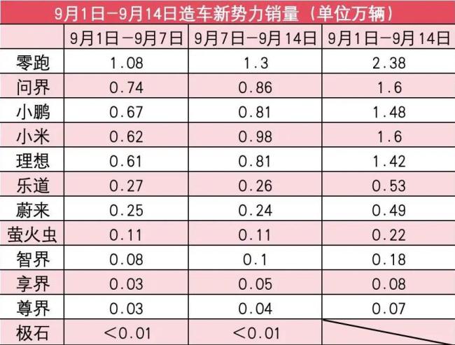 进入9月第二周(9月8日—9月14日),多家新势力销量都稳步回升。