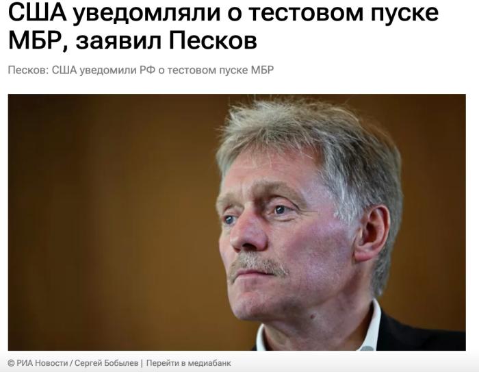 佩斯科夫:美方试射“民兵3”洲际弹道导弹前 已告知俄方