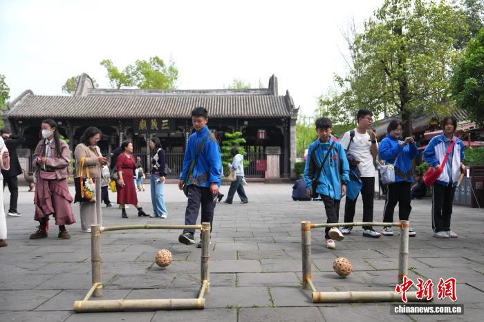 4月1日,四川成都,小学生在玩蹴鞠游戏。中新社记者 安源 摄 4月1日,四川成都,“三国寻梦线”双层主题巴士抵达武侯祠博物馆。中新社记者 安源 摄
