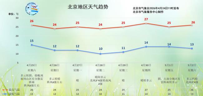 今天北京天空云量较多,太阳时隐时现,气温逐渐上升,预计最高气温为26℃,大部分时间适合户外活动。前往山区的朋友需要注意午后可能出现的分散雷阵雨,以及局地阵风,风力可达6级左右,记得防风防雷雨,开车时应减速慢行