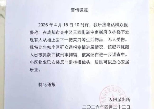4月23日,成都市公安局金牛区公安分局天回派出所发布警情通报,称4月15日上午10时左右,接到群众报警,在中南樾府小区3栋楼下发现有人从楼上丢下菜刀等生活物品,但未造成人员受伤。目前犯罪嫌疑人已被抓获并刑事拘留,案件仍在进一步调查中