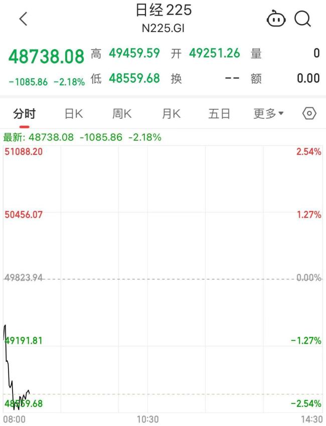 21日,日本股市表现疲软,日经225指数迅速跌破49000点。截至发稿时,该指数跌幅超过2%,报48738点,再次下跌超过千点。此前在本周二(18日),日经225指数也出现了开盘跳水跌超千点的情况
