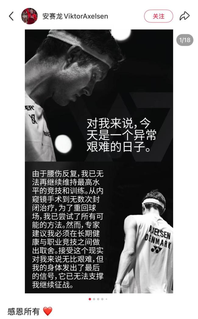 安赛龙宣布退役。体育赛场注定有一代代运动员谢幕,这一次轮到了32岁的安赛龙。作为来自丹麦的羽毛球名将,他在职业生涯中留下了辉煌战绩,为欧洲羽毛球创造了里程碑,在羽毛球赛场留下了属于自己的印记